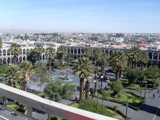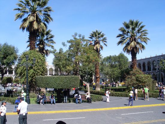 Unsere erste Station in Peru ist die wunderschoene weisse und recht spanisch anmutende Kolonialstadt Arequipa (760.000 Einwohner) im Sueden des Landes. Arequipa liegt auf knapp 3000 m und ist umgeben von den hohen, schneebedeckten Bergen und Vulkanen der Anden. Die Stadt wurde 1540 von den Spaniern "gegruendet" (nachdem sie natuerlich alles platt gemacht hatten, was vorher da war) und danach immer wieder von Erdbeben zerstoert. Wegen der Erdbebengefahr gibt es hier auch keine hohen Gebaeude, was natuerlich ein Genuss ist!
