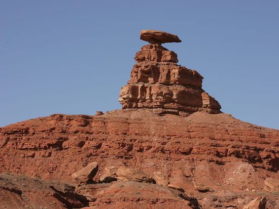 Nachdem wir im Hat Rock Inn in dem kleinen Örtchen Mexican Hat eingecheckt hatten, fuhren wir noch schnell zum Gooseneck State Park und zum Mexican Hat, um dort noch ein wenig die Aussicht zu genießen. Woher der Ort Mexican Hat seinen Namen hat? Nun seht selbst...