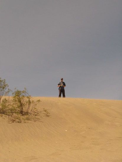 Temperaturen hatten mittlerweile ganz schön angezogen. Unser erster Stop war Stovepipe Wells, wo wir uns angemeldet haben. Weiter ging es ein paar Meilen bis wir die Mesquite Flat Sand Dunes erreichten. Dünen, die von Bergen umgeben sind. Wir konnten es uns natürlich nicht nehmen lassen, einen kleinen Spaziergang zu machen. Dafür hieß es aber zunächst eincremen, Mütze auf und Wasser einpacken. Die Temperaturen lagen bestimmt bei 40 Grad und nach unserer kleinen Wanderung, die nicht mehr als 30 Minuten in Anspruch nahm, waren wir beide vollkommen durchgeschwitzt.