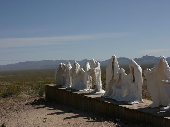 Wir haben hier im Motel 6 eingecheckt. Leider haben die keinen Pool, denn den hätten wir bei der Wärme gut gebrauchen können. Dafür haben wir gleich noch mal einen Abstecher in die Ghost Town Rhyolite gemacht. Viel zu sehen gab es dort allerdings nicht. Die Stadt wurde 1904-5 gegründet, nachdem man dort Gold gefunden hatte. Einige Jahre später hatte der Ort schon 10000 Einwohner. Da jedoch die Goldmine nicht länger finanziell unterstützt wurde, verschwand der Ort auch so schnell wie er gekommen war. Heute stehen hier nur noch ein paar Ruinen und ein paar Ausstellungsstücke von verschiedenen Künstlern.