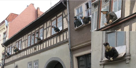 Auf dem Weg zum Parkplatz ausserhalb der Stadt fallen uns einige Häuser auf, aus deren Fenster Puppen herausschauen.