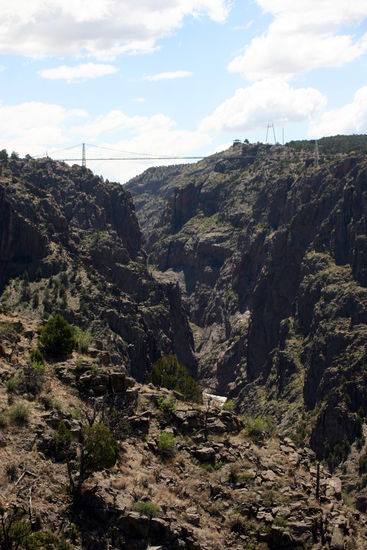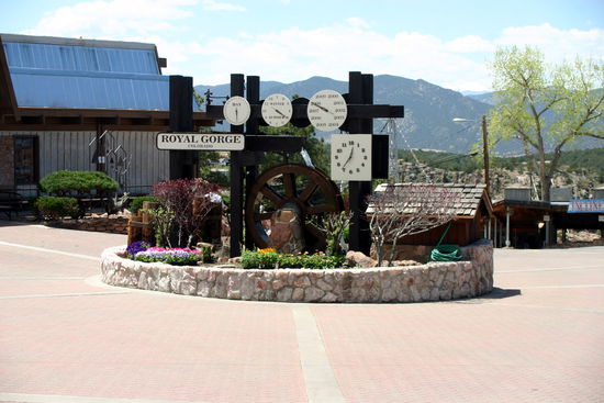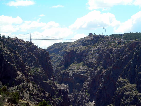 Nach der Bahnfahrt fuhren wir das letzte Stück bis zur Brücke mit dem Auto. Zur Brücke gehört ein kleiner Vergnügungspark. Gegen 24 Dollar Eintritt kann man im Schrittempo selber darüber fahren; interessanter ist jedoch die Überquerung zu Fuß, da man durch die Holzplanken hinunter auf den Arkansas River sehen kann. Wer möchte kann die Schlucht auch mit der Seilbahn überqueren, oder mit einer Standseilbahn hinunter zum Fluß fahren.