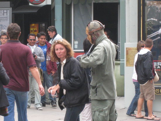 Während ich bei den Sternen und Fuß-Hand-Abdrücken nach mir bekannten Persönlichkeiten suchte hat sich dieses Monster (ich vermute aus Star Wars - ma was es net genau) an mich herangeschlichen und hinter mir Blödsinn getrieben - angeblich mich sogar mit einem Messer bedroht . Hier dürfte ich dann bemerkt haben, dass wer hinter mir herumschleicht und Gabi hat´s natürlich festgehalten.