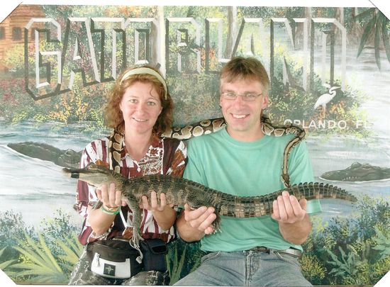 Tja, aber das Wetter hat sich von seiner guten (nicht besten), aber eben guten Seite gezeigt, so hat uns Kurtl zum Gatorland gebracht und er und Gabi sind shoppen gefahren. Gatorland ist einfach Traumhaft, nur bei der Vogelspinne bin ich gleich ein paar Schritte rueckwaerts gegangen. Aber einen Riesen-Aligator haben wir gebaendigt. Nach der Baendigung hatten wir noch ein Fotoshooting und dann hatte der Wettergott kein Erbarmen mehr mit uns.
