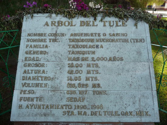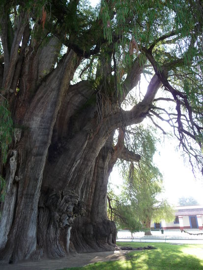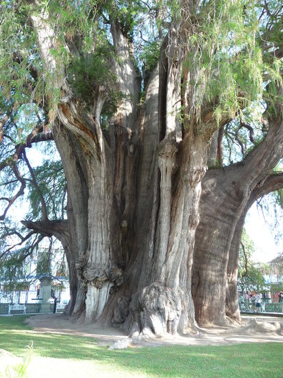 Nicht weit von Oaxaca entfernt steht eine ganz besondere Persönlichkeit nämlich der Riesenbaum von Tule.Er gehört zur Art der mexicanischen Sumpfzypresse und ist mit 14 m Stammdurchmesser der dickste Baum der Welt.Er ist 1200 bis 3000 Jahre alt,ist 42 m hoch und hat einen Umfang von 46 m.