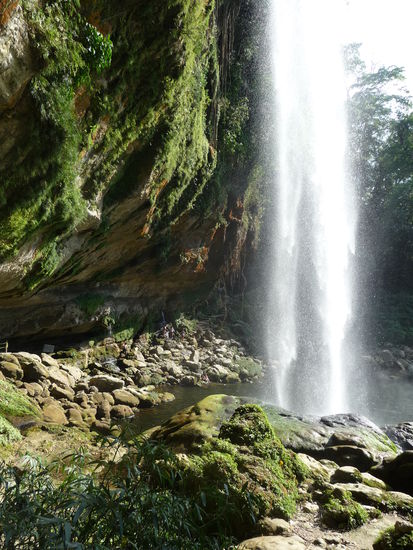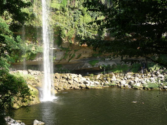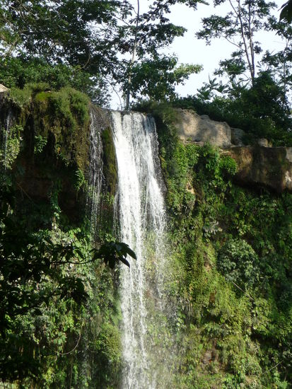 Ca 20 bis 25 Km westlich von Palenque im Bundesstaat Chiapas liegt der Wasserfall Mishol-Ha bei den das Wasser über 35 m tief in ein See stürzt der von üppigen Urwald umgeben ist.Hinter dem Wasserfall befindet sich eine Höhle mit einen kleinen See darin.Die Temperaturen erreichen jetzt 38 Grad im Schatten.Auf den Weg nach Palenque ein schöner Fotostopp und Badegelegenheit.