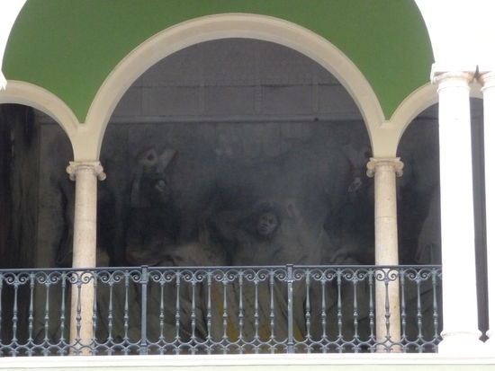 Hier gut zu sehen wie der spanische Eroberer auf den Köpfen der unterdrückten Mayas rumtretet und damit zeigen möchte wer die Macht hat.
