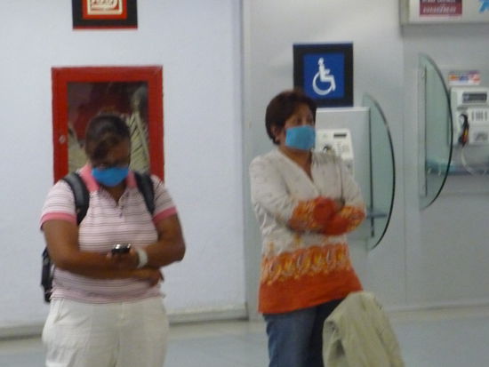 Das die Panik vor der Schweinegrippe inzwischen voll um sich greift besonders im Großraum Mexico City ist auch am Flughafen nicht zu übersehen.