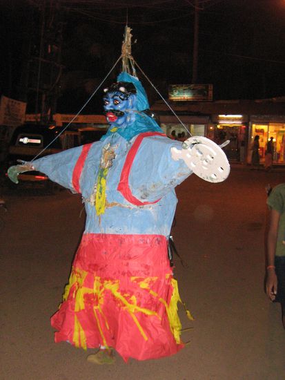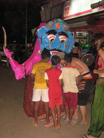 Als wir Dienstag in Agonda angekommen sind, haben wir uns natürlich wieder bei der Maria einquartiert. Inzwischen hat auch hier ein Internetcafé und mehrere Restaurants offen. Am Donnerstag ist die Christiane wieder zu uns gestoßen und wir haben mit einem leckeren Rotwein darauf angestoßen. Hier gibt es inzwischen auch einen Weinshop. Am Freitag haben wir zu dritt einen Ausflug nach Palolem gemacht und uns eine richtige Salami-Pizza gegönnt. Für einen Ausflug ist Palolem immer wieder schön. Da momentan Diwali gefeiert wird, haben wir dort riesige Figuren aus Pappe gesehen, in denen meistens Jungs steckten. Die anderen Jungs drum herum sammelten Geld für die Feierlichkeiten (Feuerwerk, etc.) ein. Am Samstag war der richtige Feiertag aber leider haben wir davon nicht viel mitbekommen, da hauptsächlich in den Familien gefeiert wird und in Agonda fast nur Katholiken leben. In Palolem leben viele Hindus aus anderen Bundesstaaten und haben dort ihre Shops. Ansonsten verbringen wir unsere Tage wieder mal mit sonnen und baden. Unsere Farbe vom letzten Aufenthalt war ja schon wieder sehr verblasst und drum heißt es die nächsten Tage: Strand, Strand und nochmal Strand. Haben bereits unser Zugticket nach Chennai gekauft uns so müssen wir am Donnerstag wieder Abschied nehmen. Ganz schlimm wird es wieder für den Prinz (Hund) werden. Die Maria hat uns erzählt, dass er das letzte Mal, als wir abgereist sind ganze drei Tage lang nichts gefressen hat und sie ihn nur mit Keksen dazu bewegen konnten, wieder was zu fressen. Als wir am Dienstag angekommen sind, war er den ganzen Tag unterwegs und als er uns Abends erblickte, hat er uns richtig angesprungen und sich gefreut wie ein kleines Kind. Der ist einfach sooo süß. Jetzt geht er wieder jeden Tag mit uns spazieren und lässt uns, wenn möglich, nicht aus den Augen. Sogar die Maria und die Alinda werden angeknurrt, sobald sie auf unsere Terrasse treten. Er muss ja "unser" Reich verteidigen. Die nächsten paar Tage werden wir noch richtig genießen. Also dann....
