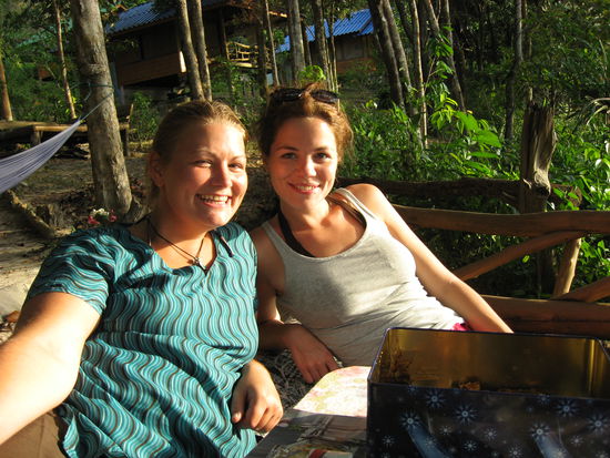 Unsere deutschen Bekannten aus dem Bus nach Ranong haben mit der Gästehaus-Besitzerin (Sao) dort auf uns gewartet und wir sind mit Rollern zur Contact-Anlage gefahren. Die drei wohnen auch in dieser süßen kleinen Anlage. Daniel und Manu haben sich gleich einen Roller ausgeliehen und sind mit der Bine und der Tanja im Schlepptau ins Dorf gefahren um ein paar Kleinigkeiten zu besorgen. Abends sind wir noch sehr!! gemütlich zusammen gesessen, haben Bier (ich habs wegen des Antibiotikas bei einem belassen) und Cocktails getrunken und in Manus Geburtstag rein gefeiert. Irgendwann so gegen 2, als der Generator schon ewig aus war und wir nur noch im Kerzenschein da saßen, sind wir dann ins Bett gefallen. Am Sonntag haben die drei "neuen" lange geschlafen aber die Tanja und ich waren schon wach. Die Tanja hat mit dem Henri ne Rollertour um die Insel an verschiedene Strände gemacht und ich hab gewartet, bis die andern endlich aus den Federn kommen. Danach haben auch wir eine Tour auf der Insel gemacht. Die Bine und ich sind irgendwann selber gefahren, um es mal auszuprobieren. Sind beide noch nie Roller gefahren aber es war echt super leicht. Ist aber gleich was anderes sobald hinten jemand mit drauf sitzt. Also haben wir wieder Fahrerwechsel gemacht und die Jungs sind weiter gefahren. Die Landschaft hier ist echt ein Traum. So viel Natur und nur ein paar vereinzelte kleine Anlagen. Abends haben wir ein bisschen Karten gespielt und lecker zu Abend gegessen. Die Stunden vergehen immer wie im Flug. Montag haben wir uns einen dritten Roller dazu gemietet, denn ich bin ja nun ein großes Mädchen und kann schon alleine fahren. Die Tanja saß aber beim Daniel hinten drauf. Sind zu einem ruhigen Strand auf der anderen Seite gefahren und haben dort ein paar Stunden als Sonnenanbeter verbracht. Außer uns und 2 Fischern war keine Menschenseele an diesem Strand. Das Wasser war aber extrem niedrig. Man musste ewig weit rein und da stand man immer noch nur bis zu den Oberschenkeln im Wasser und als die Ebbe kam, stand man nur noch mit den Zehen im Wasser. Danach sind wir noch zu einer anderen Anlage, wo die Tanja am Vortag mit dem Henri war. Dort wird ein kleiner Affe gepflegt, weil er und seine Mutter angefahren wurden. Die Mutter hat es leider nicht überlebt und die Kleine hatte nen gebrochenen Fuß. Inzwischen ist sie aber wieder relativ fit und hat gleich mal der Bine den Haargummi aus den Haaren gezogen und ist damit davon gelaufen, soweit es ihre Leine zuließ. Die Bine hat den Haargummi aber dank der "Pflegerin" wieder zurück bekommen. Nach einem kleinen Snack mussten wir uns beeilen, wieder in die Anlage zu kommen, denn ein Gewitter braute sich zusammen. Haben es grade noch so geschafft, bevor es so richtig anfing zu gießen. Dienstag sind die vier wieder mit den Rollern los und ich bin in der Anlage geblieben um endlich mal ein paar Berichte zu schreiben. Konnte sie aber zu dem Zeitpunkt noch nicht einstellen. Am Abend saßen wir wieder gemütlich zusammen und als wir Karten spielen wollten bin ich schnell zur Hütte um die Karten zu holen. Da lang was auf dem Boden. Erst nachdem sich das kleine lange Tierchen bewegte, merkte ich, dass es eine Schlange ist. Hab gerufen, dass jemand kommt und der Daniel und der Jens (auch ein Deutscher, den wir an diesem Abend kennen lernten) kamen. Hatte total Angst, dass der Daniel die Schlange einfach anfassen will, denn wir wussten ja nicht, ob sie giftig ist. Der Jens ist dann rein und die Schlange zu nem Spalt in der Wand. Er meinte, sie sei aus der Hütte raus. Sind also wieder zurück und haben Karten gespielt. Als wir ins Bett gehen wollten, standen die Tanja und ich vor der Hütte und haben die Tür aus einem Meter Entfernung geöffnet und kurz darauf hat die Tanja laut aufgeschrien. Tja, die Schlange war immer noch da. Der Daniel ist wieder gekommen und wir haben überlegt, für die Nacht das Zimmer zu tauschen. Aber die Sao hat auch alles mitbekommen und hat sich die Schlange kurz angesehen. Leider konnte auch sie nicht sagen ob sie giftig ist oder nicht, denn sie hat eine solche anscheinend noch nie gesehen. Na super. Daraufhin hat sie die Schlange mit einem Messer aus der Ritze geholt und getötet. Leider. Danach hat sie sie mit runter genommen und hat sie einer anderen Thailänderin gezeigt. Diese wusste, dass die Schlange eine Zwergenboa war und nicht giftig. Danach hatten wir natürlich ein super schlechtes Gewissen, weil wir mit Schuld an ihrem Tod waren. Wir haben inzwischen schon so viele Tiere gesehen und im Zimmer gehabt, das ist Wahnsinn. Wir hatten auch einen Frosch und einen riesigen Tausendfüßler im Zimmer (sind auch giftig), Bine und Manu hatten zwei kleine Skorpione und einen großen Leguan im Zimmer und auf der Straße haben wir einen Varan gesehen. Am nächsten Morgen gings mit dem Boot nach Ranong, von dort mit dem Bus nach Chumphon und weiter mit dem Katamaran nach Ko Tao.