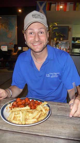 Da wir uns in der Küche frei bedienen konnten, gab es für Philipp an einen Abend mal eine gute deutsche Manta-Platte: Currywurst mit Pommes!!!