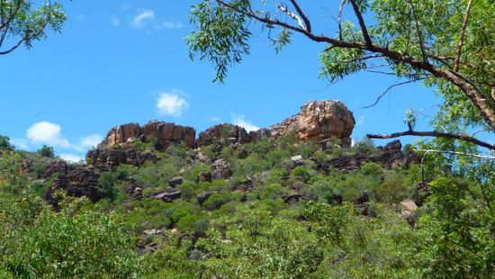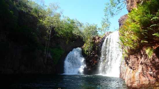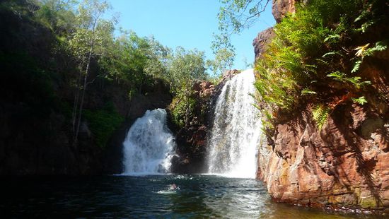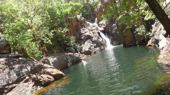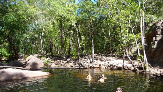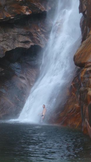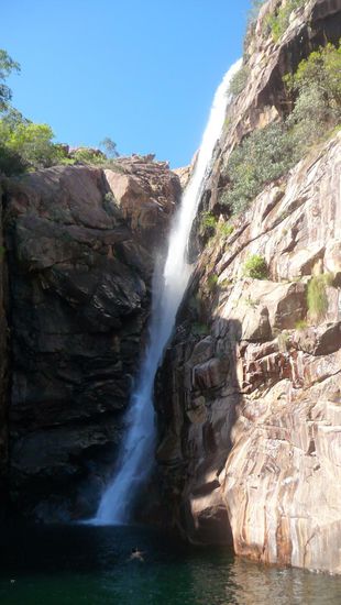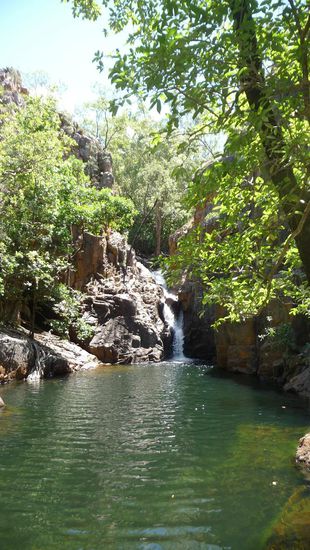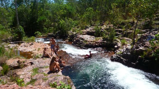 Am letzten Tag standen dann nur noch 2 Stopps auf dem Programm, da wir ja eine lange Rückfahrt nach Darwin vor uns hatten. Am Morgen sind wir gleich wieder 3,5 Kilometer zu den Motor Car Falls gelaufen. Der Marsch war es auf jeden Fall wert, denn uns erwartete ein weiterer super Wasserfall bei dem man wieder in angenehm kühlem Wasser planschen konnte. Anschließend ging es zum Boulder Creek unserer letzten Station auf dieser Tour - auch hier konnte man natürlich wieder Schwimmen und Springen.