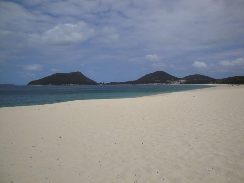 Nach gutem Schlaf in stuermischer Nacht fuhren wir mit Martin am Steuer weiter Richtung Nelson Bay. Nelson Bay liegt an einem riesiegen Inlet, bzw. Lagunen, Seen und Flussmuendungssystem Port Stephens genannt. Unser Caravan-Park liegt auf einer Halbinsel mit einem Leuchturm auf der huegeligen Anhoehe. Auf beiden Seiten hat es Badestraende, wobei der oestliche "Shoal Bay" mit ca 4km Laenge beeindruckender ist. Die Fische, wie sich dann herausstellte, bissen aber besser am kleineren Strand.