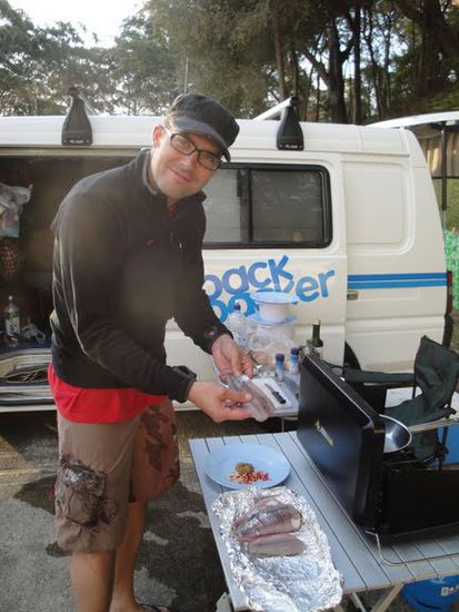 Am Abend hat Martin dann nochmals sein Glueck beim Fischen probiert. Und siehe da, unser Abendessen ist erneut lecker, lecker Tailor! Martin war so nett und hat das aeltere Paaerchen vom Vortag wieder mit ein paar Fischen beschenkt. Dafuer haben die uns zu sich nach Hause eingeladen; machen wir doch glatt, wenn wir Richtung Melbourne fahren. Die Fischfilets wurden diesmal an einem Knoblauch-Kraeuter-Butter und in Alufolie auf dem Grill gegart. Das war wieder das reinste Festessen. Mit vollem Bauch schliefen wir zufrieden ein...