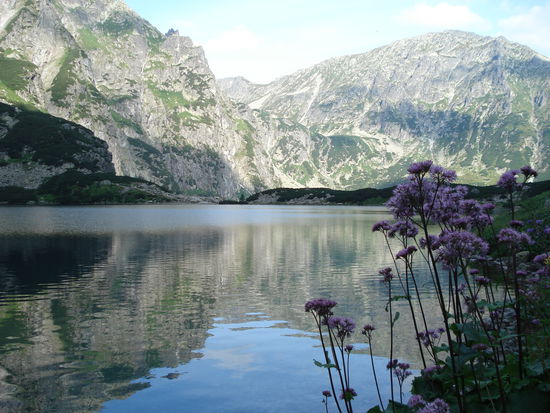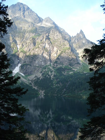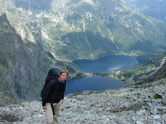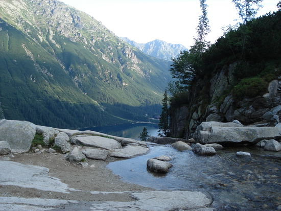 Es waren tatsaechlich schon einige Wanderer unterwegs. Nach einer stunde erreichte ich den oberhalb des Morskie Oko gelegenen See. Zu gern waere ich in einen der Seen reingesprungen, aber es ist Naturschutzgebiet und streng verboten. Die Seen hier oben sind deshalb so sauber und klar, wie man das sonst nirgens sieht. Man kann ueberall auf den Grund gucken udn die Fische sich tummeln sehen. Am Berghang entdeckte ich einige Gemsen, die grasten und manchmal flogen grosse Greifvoegel an de Hangen entlang. Baeren soll es hier auch geben. Es wird aber nur sehr selten einer gesehen, da sie sich von Menschen fern halten. Besser so.