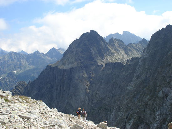 Auch hier hoerten die Pfade irgendwann auf und es ging ans Klettern. Ich wunderte mich, wieso bei diesen gefahrlichen Afstiegen und in den steilen Passagen trotz so vieler Leute so selten etwas passiert. Es war jedenfalls sehr schweisstreibend trotz der zunehmenden Kaelte. Doch um 11.30 Uhr, nach 4 1/2 Stunden hatte ich es geschafft. Ich stand auf dem Gipfel. Tolles Gefuehl. Allerdings musste ich mir dort erstmal einen Platz suchen. er Gipfel ist naelich sehr eng und es waren bereits viele Leute oben. Es gab beste Sicht in alle Richtungen. Ich konnte meinen ganzen Wanderweg der letzten Tage nachverfolgen und weit in die Slowakei hinein blicken. Ich kam dan noch mit zwei Deutschen ins Gespraech, die am Morgen von Strbske Pleso in der Slowakei aufgestiegen waren und auch wieder dorthin wollten.