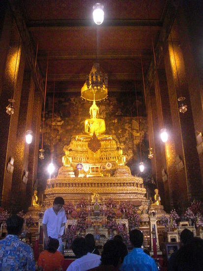 Wir besichtigen Wat Po den wohl meist besuchten Tempel Bangkoks! Wat Po oder auch Wat Phra Kaew beherbergt den 46 m langen liegenden Buddha der den Übergang Buddhas ins Nirvana symbolisiert. Die Ausmaße kann man unmöglich beschreiben, ebenso wenig wie die Atmosphäre einer Tempelanlage, wo auf der einen Seite Trubel und Betriebsamkeit wie auf einem Jahrmarkt herrschen und nur wenige Meter weiter Buddhisten ins Gebet versunken vor einer goldenen Statue knien.