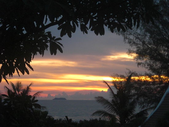 Wir essen im Hotel und sehen zum ersten Mal die Sonne glutrot hinter Ko Phi Phi versinken.