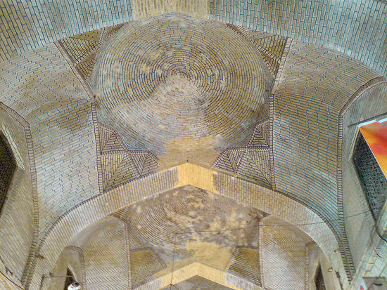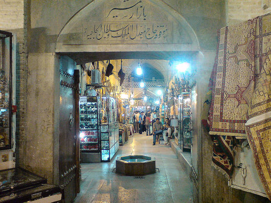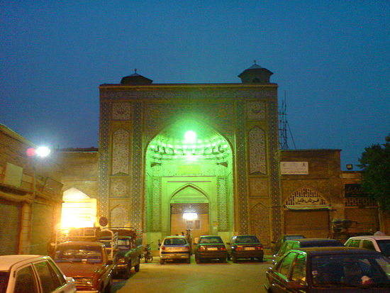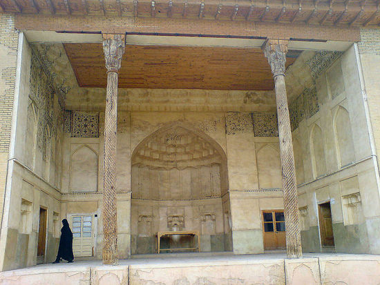 Mein Spaziergang führt mich zur Masdjed-e Atiq, die alte Freitags- moschee. In der Mitte des typischen vier-Iwan-Hofes steht das Khodai Khaneh, "Haus Gottes". Die ausufernden, runden Eckeinfassungen erinnern an die Türme einer Burg. Ein Schriftband auf türkisblauem Grund zieht sich oberhalb der Säulen um das ganze Gebäude. Zwei Frauen sitzen in einer schattigen Ecke und reden gedämpft miteinander. Ein alter Mann in ausgebeultem, braunen Anzug schleicht langsam über den Hof.