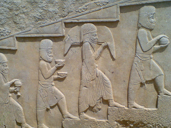Von der Hundert-Säulen-Halle sind nur noch die Sockel der Säulen, die bei dem Brand zerbarsten und die gewaltigen steinernen Türrahmen der acht Eingänge übrig geblieben. Die Überreste der Apadana, in der die Empfänge zum Neujahrsfest stattfanden, bringen nur noch einen geringen Eindruck davon, wie sie früher einmal ausgesehen haben muß. 10000 Leute fanden darin Platz. Über 20 Meter war der Palast hoch, dessen Dach nur mächtige Säulen aus Zedernholz zu tragen vermochten. Von den mit Gold beschlagenen Holztoren ist heute nichts mehr zu sehen. Hier ist auch der Fundort einer Steinkiste, die eingemauert war und die goldenen Gründungsurkunden der Persepolis barg. Eindrucksvolle Wandreliefs stellen dar, wie die Gesandten dem König zum Neujahrsfest ihre Gaben brachten. Meder, Armenier, Byzanthiner, Skythen, Babilonier und andere mit Schalen, Bechern und Tüchern in den Händen, mit Schafen, Kamelen oder Pferden im Schlepptau formieren sich zu einer ganzen Prozession. Als Sinnbild für den Sieg des Frühlings über den Winter und damit für den Beginn eines neuen Jahres, rammt ein Löwe, der die Sonne symboli- siert, seine scharfen Zähne in den Schenkel eines sich aufbäumenden Stieres. Die meisten Reliefs sind noch sehr gut erhalten und damit das auch so bleibt, sind einige Bereiche mit Sperrbändern versehen, sodass niemand etwas kaputt machen kann. Nicht selten ertönen die schrillen Trillerpfeifen der strengen Aufpasser, wenn jemand versucht, über die Absperrungen zu klettern.