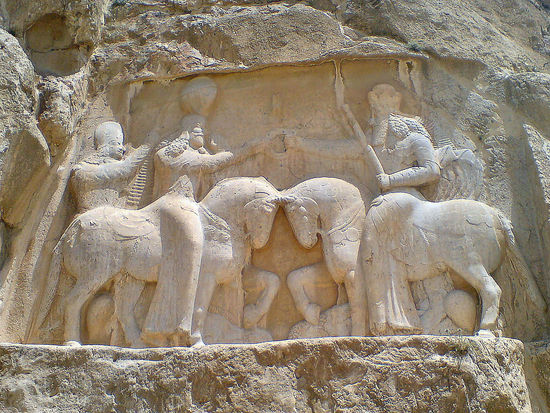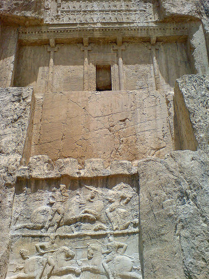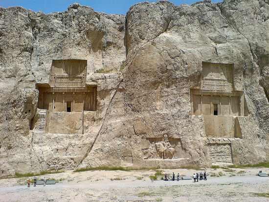 Man weiß nicht viel über die Nekropole Naqsh-e Rostam, die etwas an Petra in Jordanien erinnert. Klein wie Ameisen wirken die Leute vor den gigantischen, kreuzförmigen, hoch über dem Erdboden tronenden Vertiefungen im Fels. Die Gräber werden nur durch einen kleinen Eingang markiert, neben dem Säulen, wie eine Vorhalle zu einem Palast angedeuted sind. Eine Inschrift über dem rechten Grab, die ohne Fernglas allerdings fast nicht zu entziffern ist, nennt Darius den Großen. Man nimmt an, dass das Grab auf der rechts abknickenden Seite und die links davon auf das Konto von Darius' Nachfolgern Xerxes, Artaxerxes und Darius ll gehen. Unter den Gräbern, fast auf Bodenhöhe, wurden kämpferische Krieger zu Pferd mit Schwertern und Spießen in den Fels gehauen.