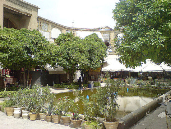 Im Bazar-e Vakil reicht mir eine junge Frau einen schmalen, einparfü- mierten Papierstreifen, bedruckt mit persischen Schriftzügen, und die Vögel in ihren Käfigen zwitschern wieder voller Fröhlichkeit. Südlich des Bazar sprechen mich zwei Touristen mit einem aufgeschlagenen Buch in der Hand an und fragen nach dem Weg. Leider kann ich ihnen auch nicht helfen.