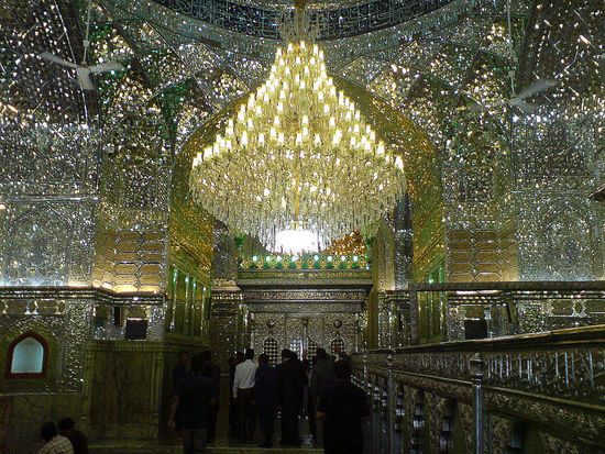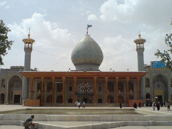 Dann sticht mir die auffällige Kuppel der benachbarten Moschee ins Auge. Sie hat fast die Form einer Birne. Es ist der Schrein des Shah-e Chiraq. Hier lieg Seyyed Mir Ahmed, ein Bruder des 8. Imams Reza begraben. Im Gegensatz zur Masdjed-e Atiq ist der Innenhof von vielen Besuchern belebt. Ein großes mit weißem Marmor eingefasstes Wasserbecken ist in der Mitte und hohe Bäume spenden mit ihrem grünen Blätterdach den ein oder andren schattigen Platz. Vor dem Eingang des Mausoleums gibt man seine Schuhe ab. Der Wärter stellt sie in ein extra dafür vorgese- henes Regal. Erst später lese ich im Reiseführer, dass Nichtmuslime seit 2002 hier eigentlich gar keinen Einlass mehr finden. Das Eingangsportal wird von einem goldenen Stalaktitengewölbe geziert. Im Inneren ist alles mit tausenden und abertausenden von kleinen Spiegeln ausstaffiert, in denen das Licht der gewaltigen Kronleuchter in alle Richtungen reflektiert wird. Ganze Schlangen haben sich vor dem Grabmal gebildet. Geduldig warten die Gläubigen, bis sie an der Reihe sind, um einen ehrfürchtigen Blick hinter die Glasscheibe zu werfen, die silbernen Gitter davor zu berühren und zu küssen. Obwohl verboten gibt es doch den ein oder anderen, der fotografiert. Auch ich ziehe mein Handy vorsichtig aus der Hosentasche und mache schnell und unauffällig zwei Fotos.
