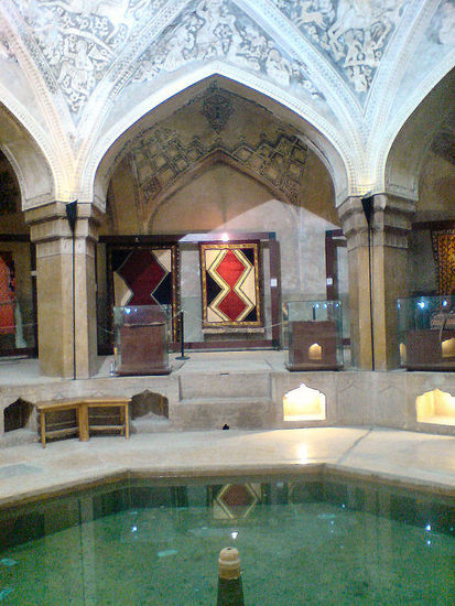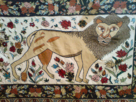 Im Hamam-e Vakil, ein altes Badehaus, ist eine Teppichausstellung. Besonders gefallen mir die Teppiche mit den Löwenmotiven. Der eine stellt eine Löwin dar, die sich mit den Vorderpfoten auf einen Baumstamm stützt und den Betrachter mit neugierigen, wachen Augen ansieht. Auf einem anderen ein Löwe, der auf der Suche nach Beute, majestätisch durch ein Blumenfeld schleicht.