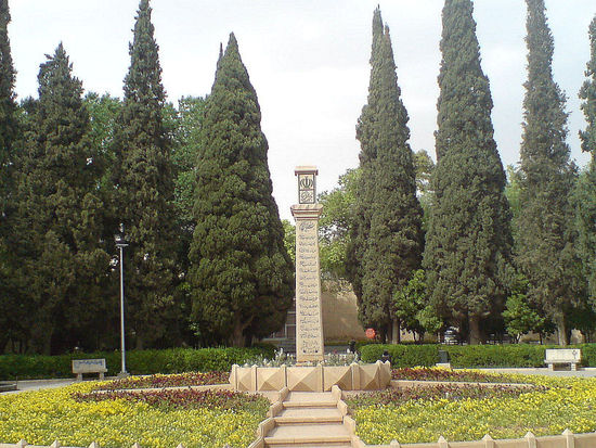 Auf der Rückfahrt klingelt Hosseins Handy. Gerade ist ein Zimmer für mich frei geworden. Am Qorantor legen wir noch einen Stop ein. Früher führte die Straße direkt durch das Tor, in dem zum Schutz der Stadt ein Koran eingemauert war. Außerdem glaubte man, wer beim Verlassen der Stadt am heiligen Koran vorbei gehe, sei auf seiner Reise beschützt. Oberhalb des Tors steht das Khwaju-Kermani-Denkmal. Es stellt den Dichter und Sufi-Meister selbst dar, wie er gerade in einem seiner Bücher schreibt. Auch seine Grabstätte befindet sich hier. Schon von hier hat man einen schönen Blick über die Stadt doch noch besser soll er vom Aussichtsturm oben auf dem Berg sein.