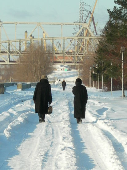 Im Abteil riecht es nach Gekochtem und Gebackenem. Die Reisenden teilen sich Hühnerschenkel, Blini (Pfannkuchen), Pilmeni (gefüllte Teigtaschen) und Piroschki(Hefegebäck), frisch erstanden von Marktfrauen am Bahngleis. Bei Minusgraden stehen die Frauen in Daunenjacke und Schürze vor Tischen mit dampfenden Kochtöpfen und warten auf Fernzüge. Ihr fliegender Handel bringt ein wenig Geld in die Haushaltskasse.