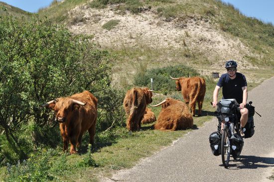 Uuuuuuuuuups, gleich nach einer Kurve auf so grosse Viecher zu treffen mit riiiiiiesigen Hoernern kann recht schreckhaft sein, man gewoehnt sich aber daran. Ueberhaupt treffen wir auf eine umfangreiche Tierwelt. In dieser Zeit trifft man auf viele Muttertiere mit ihren Jungen. Wir haben Pferde, Kuehe, viele Schafe, Ziegen, verschiedenste Voegel (Enten, Moewen, Gaense, Taucherli, Fischerreier, Schwaene, Elstern usw.), wilde Hasen auf Campingplaetzen gesehen.