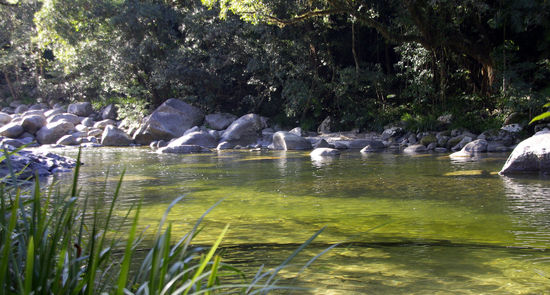 ...Cape Tribulation ist wiederum eine ganz andere Welt. Es liegt im Norden ca. 100KM von Cairns entfernt und man fühlt sich in eine andere Zeit versetzt. In Cape Trib leben ca. 150 Menschen und man kommt nur über eine Fähre über den Daintree River (Brücke gibt's keine). Mit ein bisschen Glück bekommt man dort schon ein paar Salzwasserkrokodile zu Gesicht. Eindrucksvolle Burschen denen man nicht zu nahe kommen sollte, wenn doch, keine Chance. Die machen aus allem Hackfleisch bevor du bis drei zählen kannst (kein Spaß). Aber wenn man erstmal über den Daintree ist, ist die Landschaft einfach nur WOW. Dichter Regenwald mit einem Grün das es fast in den Augen weh tut. Cape Tribulation (Kap der Trübsal) hat seinen Namen von Captain Cook, dessen Schiff, die Endeavour, hier auf Grund lief. Die Trübsal muss schon groß gewesen sein. Wenn man von hier weiter will geht das nur noch mit einem Allrad-Fahrzeug, da es ab hier keine richtigen Strassen mehr gibt. Also Pistenrütteln vom feinsten. Ich selbst war zwar nicht in Cooktown oder noch weiter nördlich aber ich hab mich mit ein paar Leuten unterhalten die dort waren und teilweise den Trip auch abgebrochen haben. Dabei geht's zur Zeit, da noch keine Regenzeit ist. Dann sind viele Pisten unpassierbar, also keine Kontakt zur Aussenwelt (oder nur sehr eingeschränkt). Wer aber Natur und abgeschiedenheit liebt dem wird da Oben das Herz aufgehen. Aber schaut selbst....