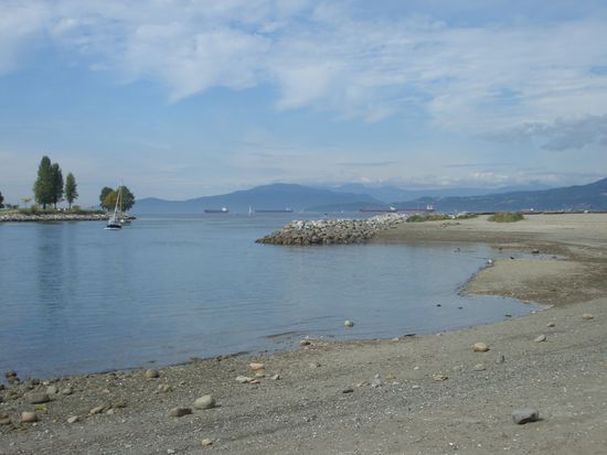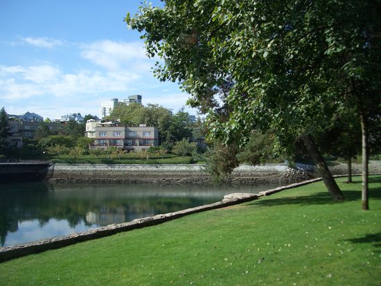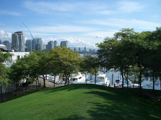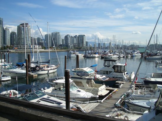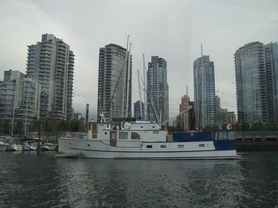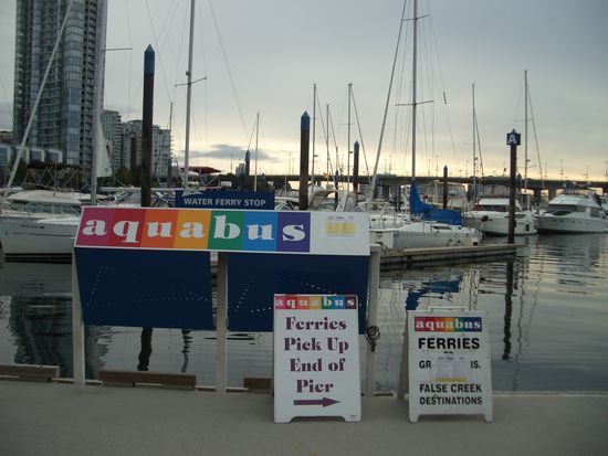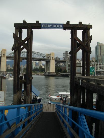 Heute morgen bin ich ganz frueh losspaziert und mit dem Aquabus nach Granville Island geschippert. Ich habe das Bootchen (@Tim und Susan: Es sieht tatsaechlich ein bisschen wie ein Pancakestapel aus, ich musste sehr schmunzeln ) ganz fuer mich allein und der Bootsfuehrer erlaeutert mir den Ueberblick ueber die Stadt. Gemaechlich kommt die Sonne hervor und kuendigt einen warmen und strahlenden Tag an. Ich habe wirklich Glueck, dass es so ruhig ist, spaeter auf dem Rueckweg sehe ich die Menschenschlange, die sich gebildet hat und darauf wartet, uebergesetzt zu werden.
