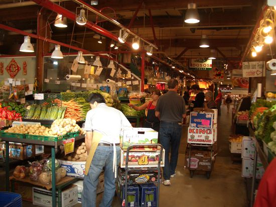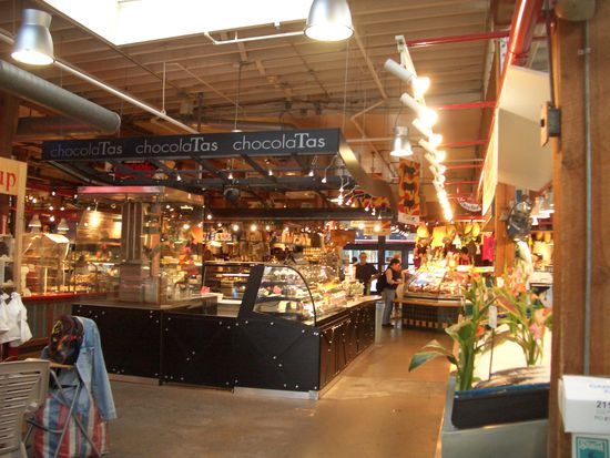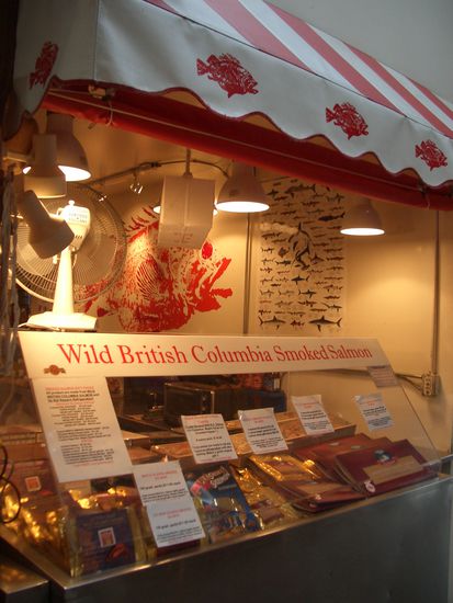 Der Granville Island Public Market ist wunderbar! Zum Fruehstueck gibts einen herrlich starken flavoured Macchiato und dazu einen warmen Himbeer-Buttermilch-Scone mit viel Butter bestrichen. Ich weiss gar nicht, wo ich zuerst hinschauen soll und nehme mir schon jetzt vor, morgen frueh auf jeden Fall wiederzukommen, um mich mit Proviant fuer die Autofahrt einzudecken. Auf Anhieb sehe ich mindestens drei Mitbringsel-Ideen, die ich mir fuer den zweiten Teil meines Vancouveraufenthalts merke. Die meisten der unzaehligen frischen Obst- und Gemueseprodukte, die hier angeboten werden, kommen aus dem nahe gelegenen Okanagan Valley, an dem ich auch vorbeifahren werde. Mein Lunch wird heute auf jeden Fall Obstsalat sein!