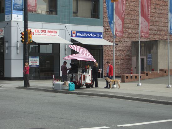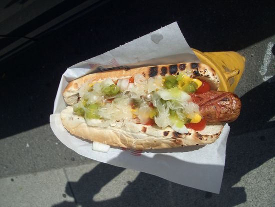 Mittags bringe ich nur schnell die Einkaeufe ins Hostel, danach gehts gleich wieder nach draussen, so ein gutes Wetter will schliesslich genutzt werden. Weil mir nur Obstsalat als Dessert zwar ausreichend, als Hauptgericht aber dann doch etwas mager erscheint, mache ich Bekanntschaft mit dem Hotdog-Man, der quasi umme Ecke (genau wie der 7 Eleven, nur ne andere Ecke) vor der Highschool und dem Kindergarten steht (wo haben die Kinder hier eigentlich den Schulhof???) und dessen Stand einen mit seinem wahnsinnig leckeren Duft lockt. Wow, das ist also ein Hotdog??? Ikea, es tut mir leid, aber ich werde zukuenftig nie wieder bei euch Hotdogs essen koennen. Das hier ist himmlisch!