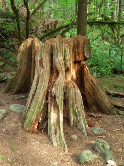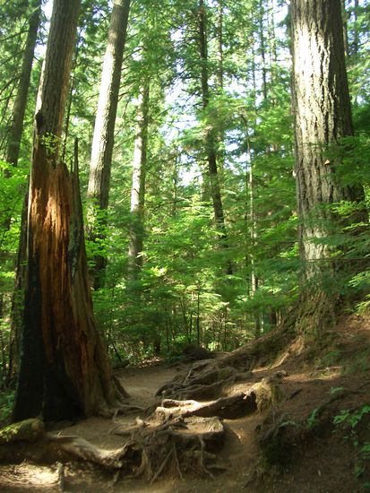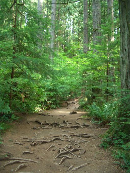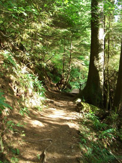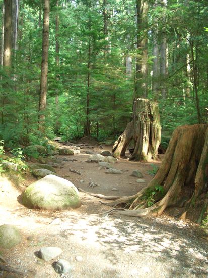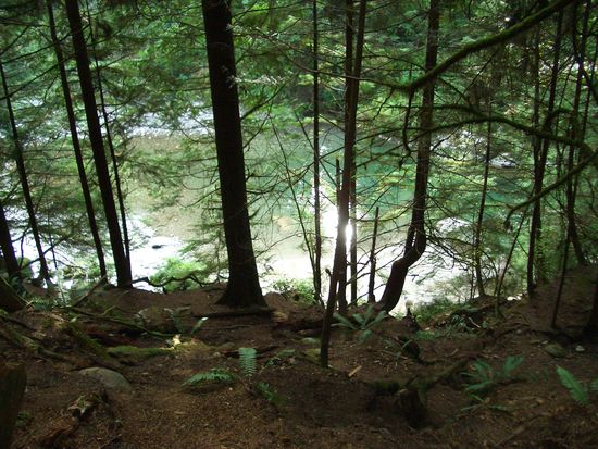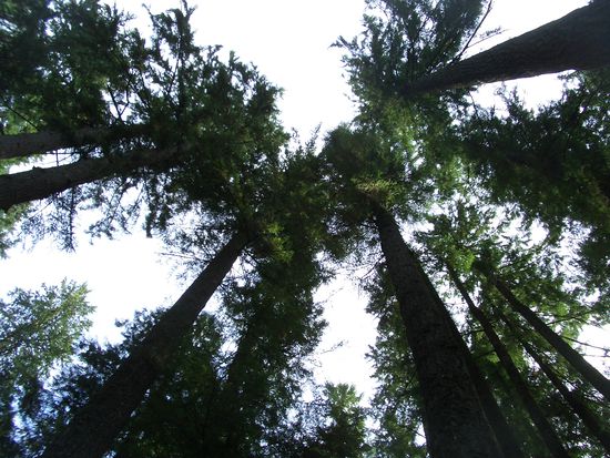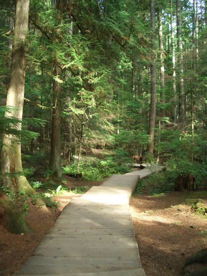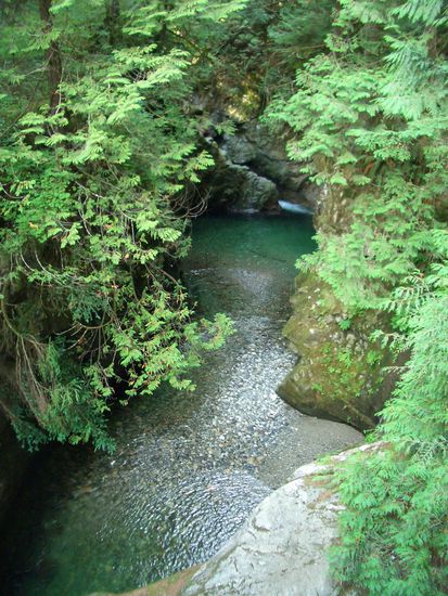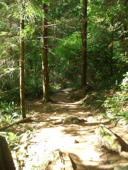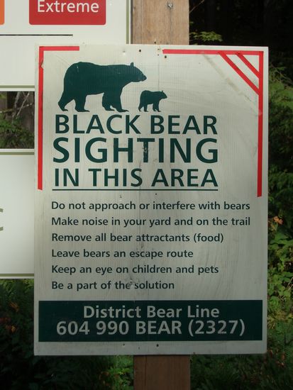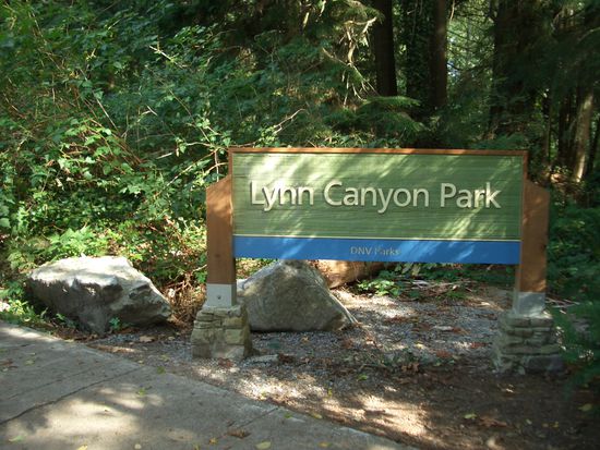 Der Lynn Canyon Park erinnert mich ein ganz klein wenig an die italienische Schweiz oder sogar den Harz. Lacht jetzt nicht, ich kanns spaeter mit Fotos beweisen! Ich ueberquere die Lynn Suspension Bridge, auf der ich merkwuerdigerweise gar keine Hoehenangst habe, obwohl sie 50 Meter ueber dem Wasser schwebt. Dann gabelt sich der Weg in mehrere Trails und ich entscheide mich fuer den Twin Falls-Trail, der nur gut eine Stunde dauern soll, da ich ja auch noch den recht langen Weg zurueck nach Downtown habe. Hier im Park entdecke ich uebrigens mein erstes Baeren-Warnschild bzw. es entdeckt mich, als ich naemlich den Plan des Parks studiere, den man kostenlos im Information Centre am Eingang erhaelt, und fast frontal dagegenlaufe. Das wird mir mit einem Baeren hoffentlich nicht passieren!