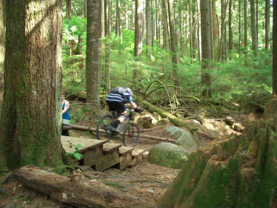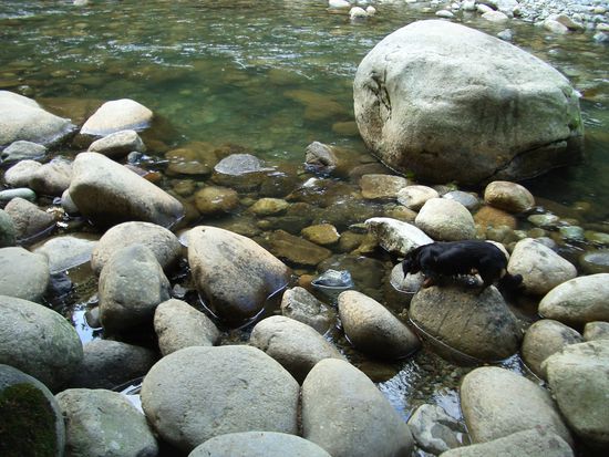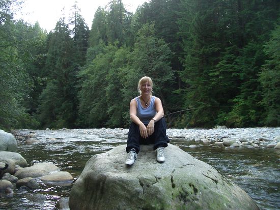 Nachdem ich eine ganze Weile hoch und runter gekraxelt bin, sehe ich am Ufer des Flusses auf den Steinen ploetzlich einen Dackel herumturnen. Er schaut mich mit grossen Augen an, kommt auf mich zu, bis er mit der Nase an mein Hosenbein stoesst und als ich mich hinunterbeuge, faengt die ganze hintere Haelfte des Hundes an zu wedeln, um mir augenscheinlich ein paar Streicheleinheiten zu entlocken. Kurz darauf kommt ein Maedchen in schaetzungsweise meinem Alter zum Vorschein und hinter ihr ein zweiter Minidackel. Sie lacht, als sie ihren Schuezling in geniesserischer Pose vor mir hockend entdeckt und entschuldigt sich, dass Mallow so aufdringlich ist. Yolaine, so heisst das Maedel, dass mir auf Anhieb sehr sympathisch ist, ist 27 und oft mit ihren beiden Hunden hier, die uebrigens auch Maedchen sind. Wir quatschen ueber alles moegliche und ich wuerde gern noch laenger bleiben, muss mich aber wegen des bevorstehenden Rueckwegs irgendwann verabschieden. Als ich ein paar Schritte gegangen bin, ruft Yolaine ploetzlich hinter mir her und fragt, ob ich denn nicht lieber mit ihr fahren wolle, sie koenne mich dann an der Skytrain Station absetzen und mir den Rueckweg mit dem Skytrain erklaeren. Na klar will ich!