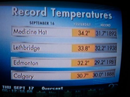 Der Trucker erzaehlt mir, wie eigentlich jeder, dass nach Calgary ueber Saskatchewan bis Manitoba die komplette Landschaft "flat" ist. "flat" ist das Wort, dass anscheinend alles dort umfassend beschreibt. Ist doch super, ein bisschen wie zuhause! Und ich werde spaeter feststellen, dass ich die "flat-ten" Gegenden in Kanada sehr mag. Als ich auch hier mein Spruechlein mit der Heimatstadt des Jaegermeisters aufsage, lerne ich etwas Neues kennen: Jaeger-bomb, very famous! Ein 0,2l Glas Redbull, in das ein Shooter Glas mit Jaegermeister versenkt wird (quasi wie bei der Irish Car Bomb, gell Steven und Ben? ), und dann auf Ex. Ich lehne eine Kostprobe dankend ab, da es nach Einbruch der Dunkelheit ploetzlich ziemlich windig und kuehl wird und ich, da ich eine Jacke vergessen habe, nun doch nach drinnen wechsle. Und schon ist das Essen da: Onion rings, Jalapenos, prawns und alles nett frittiert und mit Knobi-Dip und scharfer roter Sauce. Das ist genau das Richtige, um spaeter die noetige Bettschwere zu haben! In der Nacht wache ich dennoch ein paar Mal auf, weil der Wind staerker geworden ist und als ich morgens den Wetterkanal im TV laufen lasse, erzaehlt der Sprecher munter ueber das Risiko eines Thunderstorms und ich muss an den Film "Twister" denken. Da ein Thunderstorm im Gegensazt zu beispielsweise einem Tornado im Grunde genommen ungefaehrlich ist, hoffe ich, einen zu erleben, weil es ein Naturschauspiel sein soll. Ansonsten war die Nacht super und das Empire Motel nur zu empfehlen.
