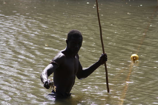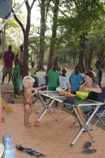 Für die 50km lange Piste fahren wir, bzw. Lars, insgesamt 14 Stunden. Das Ganze über 2 Tage! In Manantali begeben wir uns auf die Suche nach dem Gelände der GTZ von dem im Reiseführer die Rede ist. Das meiste davon wurde inzwischen verkauft, doch man gewährt uns schließlich doch einen Übernachtungsplatz und händigt uns einen Schlüssel zu einem leerstehenden Haus aus. Dass hier Deutsche am Werk waren erkennt man auf den ersten Blick; schwuppdiwupp sind wir Bewohner von 3ZimmerKücheBad. Sogar mit Badewanne! Da die Kinder von 2 Tagen roter Staubpiste schon orangefarbene Haare haben wird diese auch aufs Äußerste genutzt. Auch das Innenleben des Autos muss dran glauben. Eigentlich hatten wir uns die Ankunft von einer Piste zwar etwas gemütlicher vorgestellt -z.B. mit 'nem Sprung in den Pool und 'nem kühlen Bier- doch nach stundenlangem Großreinemachen fühlen wir uns dann doch alle wohl. Die Aktion erwies sich letztendlich zwar als fast überflüssig, da wir am nächsten Tag wieder auf einer 100km langen roten Staubpiste landen. War im Reiseführer nicht von Asphaltstraße die Rede? Aber wenigstens ist die Strecke besser passierbar... Wir nehmen noch einen malischen Fahrradfahrer mit, der genau den selben Weg wie wir in ebenfalls 2 Tagen hinter sich gebracht hatte. Tja, für manche Dinge braucht es eben doch kein Auto...