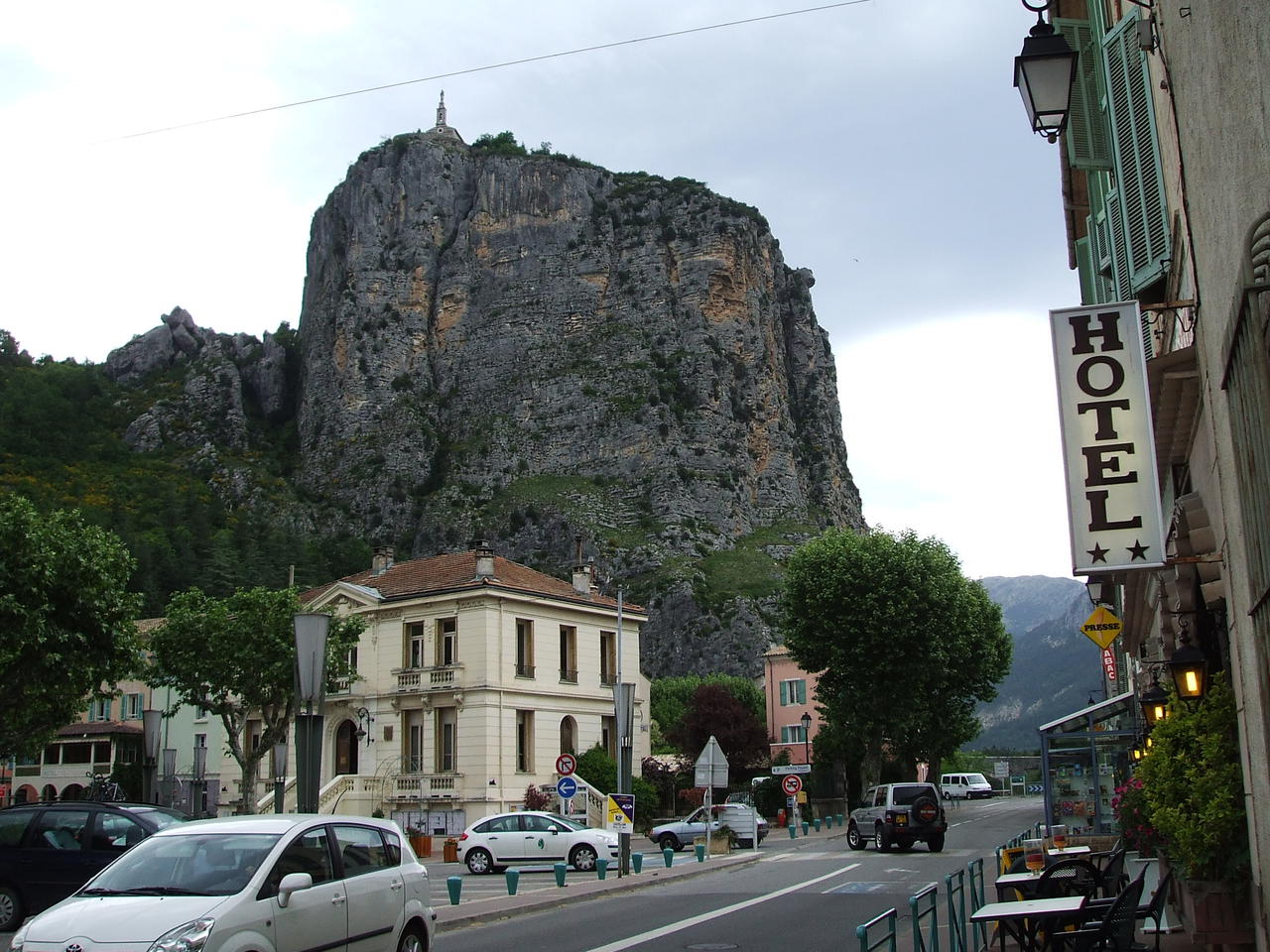 Oben auf der Passhöhe sieht man dann unten im Tal Castellane liegen mit der charakteristischen Felsnadel, auf deren Hochplateau die Kirche Notre Dame du Roc thront.
