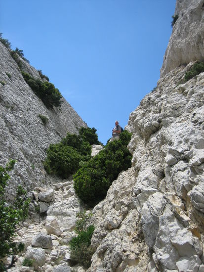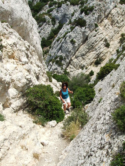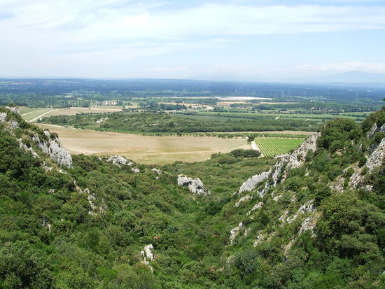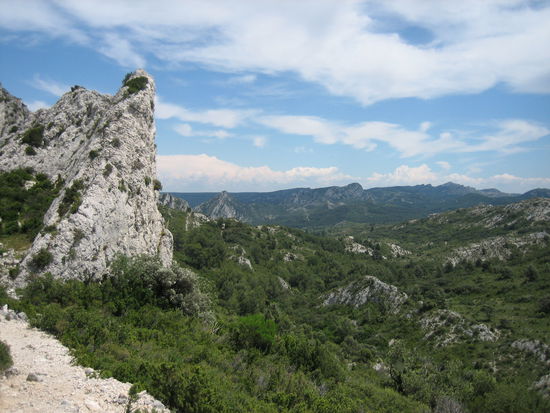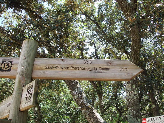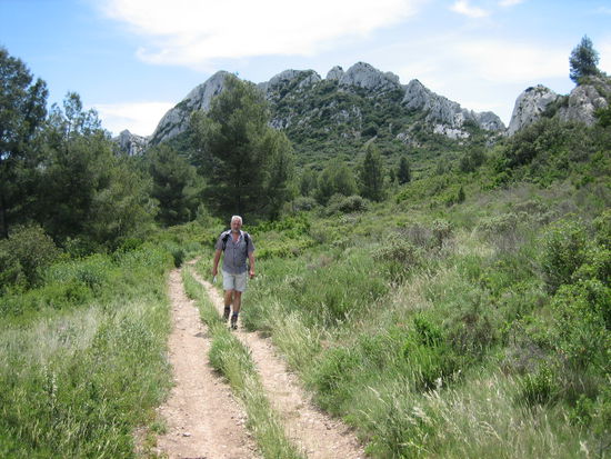 Gleich nach dem Segelflugplatz zweigt der Weg in die Alpilles ab. Es geht ziemlich steil bergauf, zuerst über einen schmalen von Steineichen gesäumten Weg, der durch Geröll ziemlich beschwerlich zu gehen ist. An einigen Passagen muss man über Felsen klettern und dabei die Hände zu Hilfe nehmen.