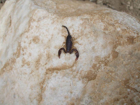 Wolfgang wäre gerne noch bis zum Hochplateau gegangen, aber mir ist es zu windig. Also drehen wir um. Am Weg sehen wir einen Skorpion, der sich auf einem Stein sonnt. Beim Abstieg verpassen wir einmal eine Abzweigung und gehen falsch - bis wir unvermittelt am Abgrund stehen. Nix wie weg hier - wieder den Berg hoch, bis zur verpassten Abzweigung.
