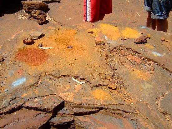Hier erklärte uns KIRTSTEY, wie die ABORIGINALS früher ihre Wandmalereien & Körperfarben hergestellt hatten. Dazu nahm sie jegliche Steine aus der Umgebung und zerrieb diese auf dem grossen Stein vor uns und siehe da ........... da kamen plötzlich unglaubliche Farben zum Vorschein!?