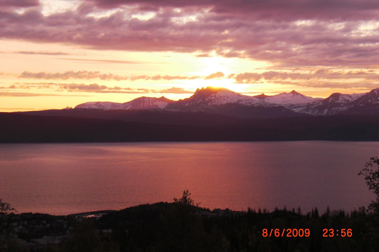 Fünf Minuten vor Mitternacht streift der untere Rand der Sonne die Bergkette hinter dem Narvikfjord.