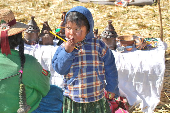 Gilbert erklärt zunächst, wie diese Inseln gemacht werden und wieso die Leute irgendwann mal überhaupt auf die Idee gekommen sind, sich vom Festland auf schwankende Ried-Inseln zurückzuziehen. So ganz genau weiss man es nicht, aber man vermutet, dass feindliche Stämme die Menschen zum Rückzug auf den See gezwungen haben und irgendwie hat sich diese Lebensweise so bewahrt. Was einzigartig auf der Welt ist ! Von Fisch- und Vogelfang ernährt man sich auch heute noch, aber ein wesentlicher Faktor ist hinzugekommen und der bringt heutzutage sicherlich das meiste Geld ein: Tourismus und Souvenirverkauf. Gilbert wird bei seinen Erläuterungen von einem Inselbewohner flankiert, der nach und nach das im Foto zu sehende kleine Inselmodell aufbaut, komplett mit kleinen Püppchen, die die Bewohner darstellen, echt ganz süss gemacht !