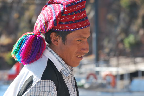 Wir verlassen die Uros Inseln und dampfen in 2,5 Stunden zur Insel Taquile, die recht weit draussen auf dem See liegt und noch sehr ursprünglich von traditionell lebenden Indios bewohnt ist. Die Insel ist schon in Sichtweite, als das Boot stoppt, um den Pipi-Tank zu leeren und neues Spülwasser aufzunehmen. Ich sitze ganz vorn im Bug und habe Blick auf die "Brücke", wo der Captain nun das Boot wieder starten will. Und wie kommt es mir doch bekannt vor, als der Motor nicht anspringen will und nach 3-4 weiteren Startversuchen der Anlasser nur noch "Klick" macht ! Genau dieses Spielchen habe ich die letzten Monate regelmäßig mit meinem nun abgewrackten Auto gespielt ! Die Batterie ist leer ! Da hilft nur aufladen oder überstarten, allerdings schlecht, wenn kein weiteres Boot greifbar ist und kein Ladegerät an Bord...Ich checke schonmal, ob wir hier Handy-Empfang haben, ansonsten könnte es etwas länger dauern... Der Captain greift auch schon nach seinem mobile und wir haben Empfang ! Allerdings hat man auf Taquile unsere prekäre Lage auch schon entdeckt, als wir so vor der Insel herumdümpeln und ein Boot ist unterwegs. Kurzerhand wird unser Boot am anderen vertäut und wir werden zum kleinen Anleger abgeschleppt.
