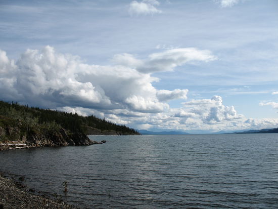 Schon am zweiten Tag erreichen wir den grossen Lake Laberge, ueber diesen ca. 60 km langen See muessen wir paddeln. Da die Wellen sehr hoch sind muessen wir schon bald anlegen. Am darauffolgenden Tag paddeln wir auch wieder bis Nachmittags, bis die Wellen zu hoch werden. Dieser Tag hat es in sich, es kommt ein gewaltiger Sturm auf, der uns 2 Tage auf der Insel festhaellt und wir nicht weiter ueber den See fahren koennen, da es zu gefaehrlich waere. Nach den 2 Tagen koennen wir endlich weiter und erreichen die Muendung vom Laberge in den lang ersehnten Yukon, nun wird alles besser, wir haben wieder Stroemung.