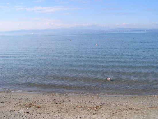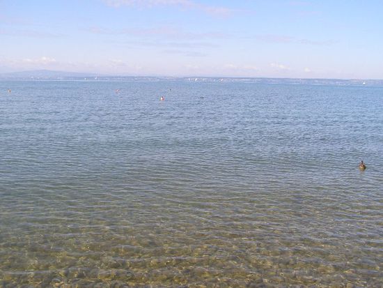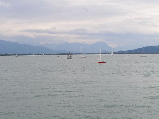 Am späten Nachmittag/früher Abend bin ich dann noch den Bodenseeradweg bis Friedrichshafen gefahren und habe dort leider erst ein Stück weiter in Fischdorf einen Campingplatz gefunden. Die Suche entschädigte dann aber mit einem kleinen, traumhaften, ökologisch vorbildlichen Campingplatz in bester Lage und mit sehr guter Ausstattung 119 Kilometer von Oberstdorf entfernt. Zur guten Ausstattung gehörte ein sehr modernes, sauberes Waschhaus mit litergenauer Duschwasserabrechnung über einen Transponder-Chip und Musik in der Dusche. Ich habe es für 30ct geschafft, angenehm zu duschen. Verschwender müssen halt draufzahlen! Als Radfahrer durfte man direkt am Wasser zelten. Den Abend habe ich dann mit einigen anderen Campern direkt am See beim Supermarkt-Abendessen verbracht.