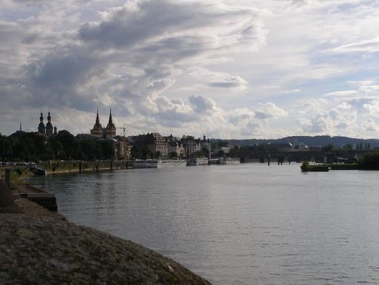 Ich hatte schon eine Fahrradwerkstatt in der Nähe der Jugendherberge ausgekundschaftet, die allerdings erst um 10 Uhr öffnete. So konnte ich dann erst einmal etwas ausschlafen und gemütlich frühstücken. Dort habe ich gleich mal den Hinterreifen auswechseln lassen und einen neuen Ersatzschlauch gekauft und war dann stolzer Besitzer eines Schwalbe Marathon plus unplattbar, der auch bisher unplatt ist. Mit diesem neuen Reifen ging es in die Mainzer Innenstadt, die jedoch nicht besonders spektakulär ist, so dass ich nach kurzer Zeit und nochmal 10 km Industrie auf dem Rheinradweg nach Bingen unterwegs war. Vor Bingen gab es viele Obstplantagen, leider wurde nirgendwo Obst direkt verkauft.