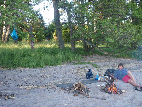 Auch der nächste Tag beschehrte uns Sonne pur. Nach getaner arbeit wir steuerten eine kleine Insel mit Sandstrand an, auf der wir schon einmal Mittagspause eingelegt hatten. Früher als erwartet erreichten wir unser Ziel und so bot sich uns auch heute genug Zeit um den rest des Tages entspannt in der Sonne zu relaxen. Abends zündeten wir dann das erste mal im Urlaub ein kleines Lagerfeuer am Strand in dem wir mal wieder Kartoffeln in Alufolie backten. Das Wasser war hier im Gegensatz zum Fluss der ersten Woche so warm das man sich morgends ohne Probleme waschen, und Nachmittags noch mal sogar als wilkommende Abkühlung ins Meer springen konnte.